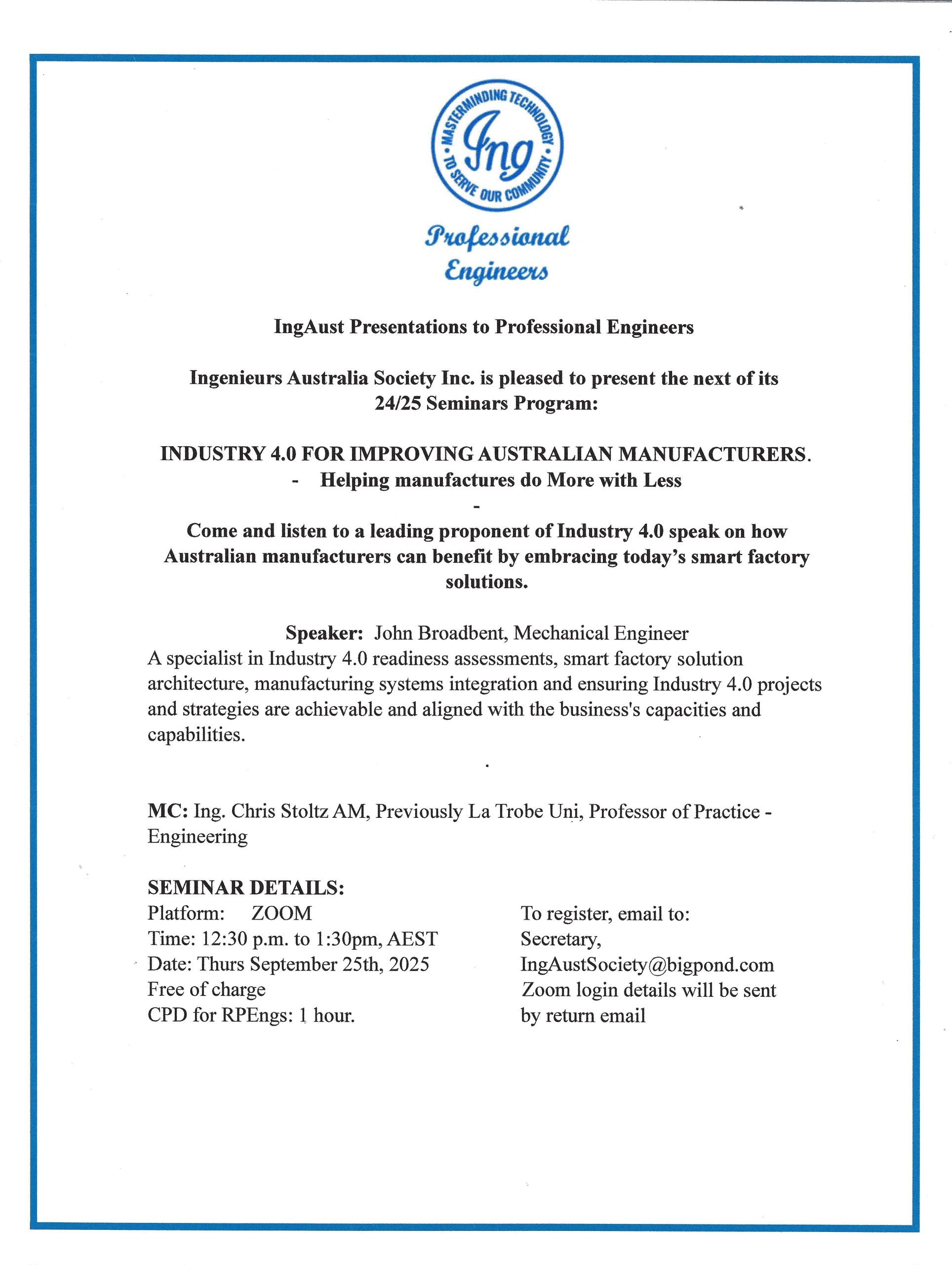 The fourth Presentation on 25 September 2025 was “Industry 4.0 for Improving Australian Manufacturers – Helping manufacturers do More with Less” and the flyer including the presentation details and the brief CV of the speaker is given below.