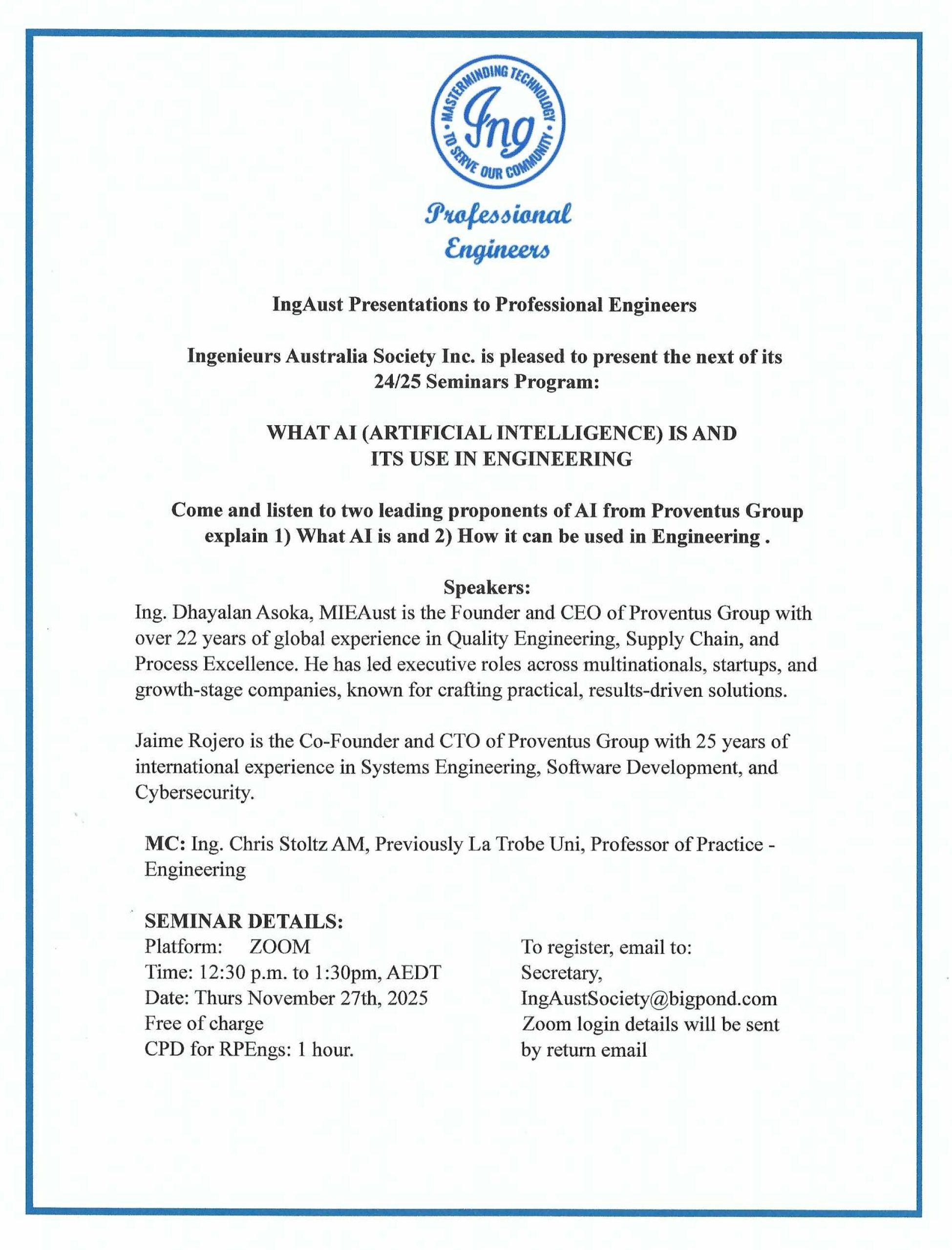 The fifth Zoom Presentation, available free of charge to all Professional Engineers and others interested in the topic, was held on 27 November 2025 starting at 12.30pm AEDT. The IngAust Society invited its members and those on the IngAust Society’s LinkedIn group, Professional Engineer members of APEA Vic as well as previous Presentation attendees to participate in this Presentation.