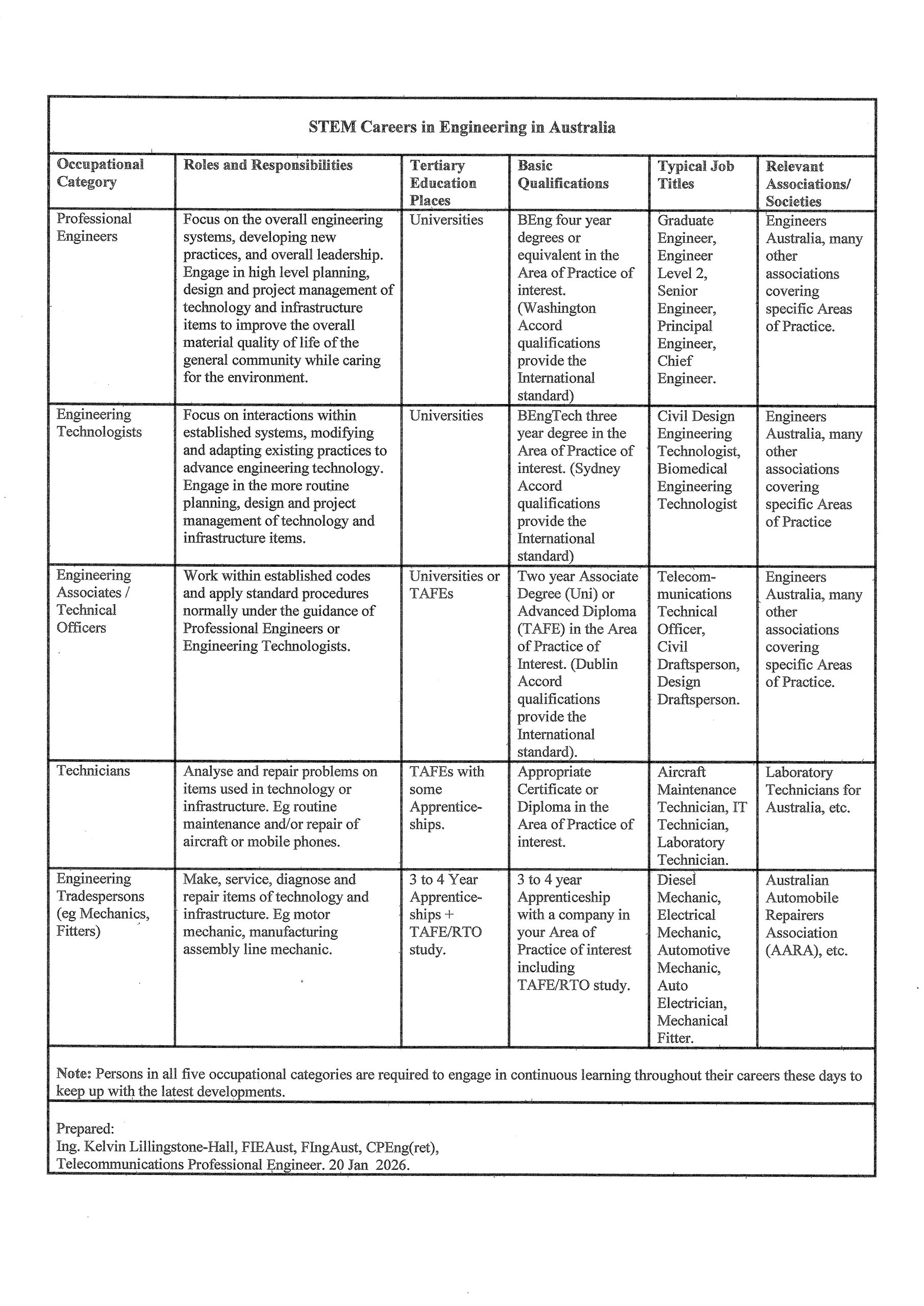 Some guidance may therefore be useful to help clarify things so these Secondary Students can choose their best prerequisite secondary school subjects appropriately as well as the University/TAFE/Apprenticeship courses they propose to undertake following their graduation from Secondary School. The aim being for each Secondary Student interested in Engineering to enter a career in the Engineering Occupation which best suits their personal skills and interests overall.